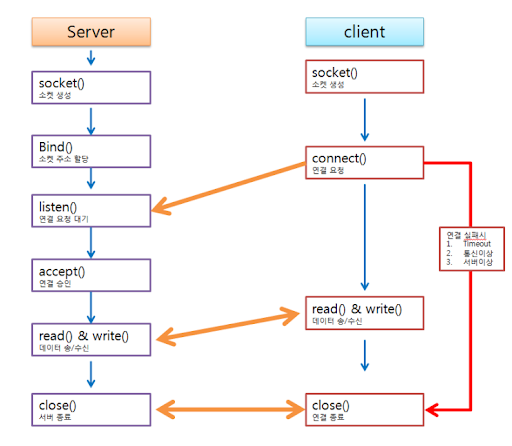 - 이를 통해 클라이언트와 서버가 read(), write()를 하며 통신 ( 반복 )